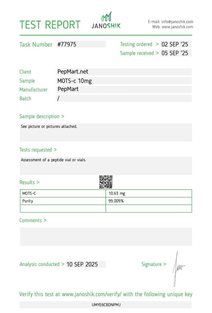 We ensure our commitment to the guaranteed highest quality through rigorous, frequent third-party testing with Janoshik. This independent verification confirms the purity and concentration of every product batch.